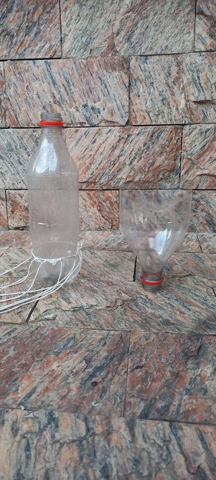 - Amarrar o funil com o fio de nylon na parte superior da garrafa de 600ml